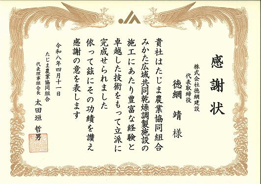先日、JAたじまみかた広域乾燥調製施設建築工事の、竣工式が執り行われ、感謝状を頂きました。